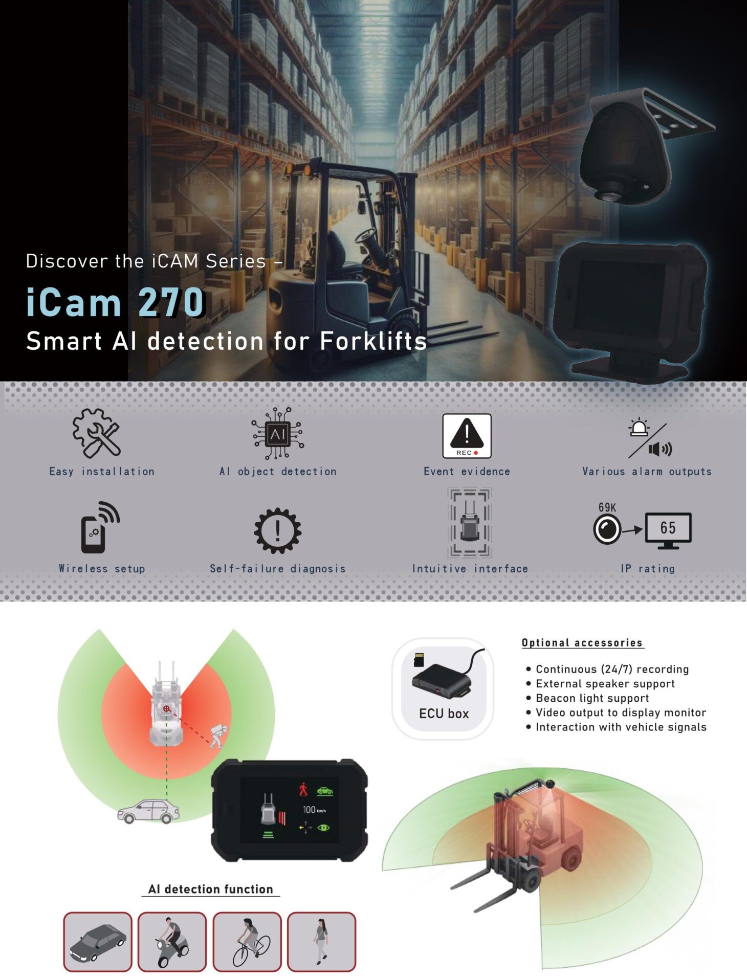 「iCam 270 工業AI偵測系統」為市場首創,針對堆高機等工業車輛設計,單一AI鏡頭可實現270度偵測,提升倉儲與工地作業安全性。商用車產品則聚焦於符合UN R159規範的MOIS與BSIS系統,以及高階後視鏡CMS (UN R46)替代方案,並已開始Level 2以上的自動駕駛影像平台開發。